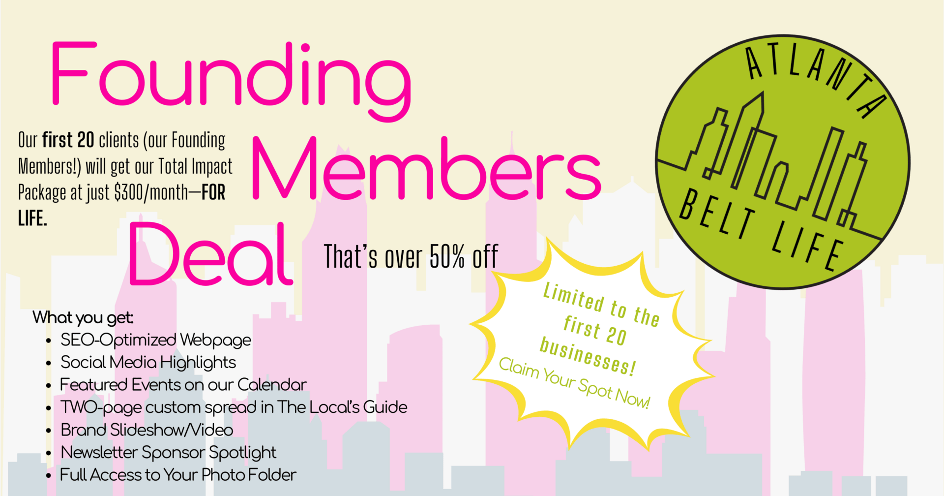We’re kicking off Atlanta Belt Life with a HUGE deal! Our first 20 clients get our Total Impact Package at only $300/month—for LIFE. That’s more than 50% off, forever.